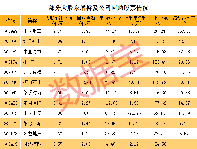 此外,榜单中的部分个股还获得了员工持股计划的买入。分众传媒8月31日发布公告称,第一期员工持股计划完成股票购买,累计成交金额超过2.7亿元,成交均价5.159元。而恒力石化则在今年7月3日发布第三期员工持股计划。