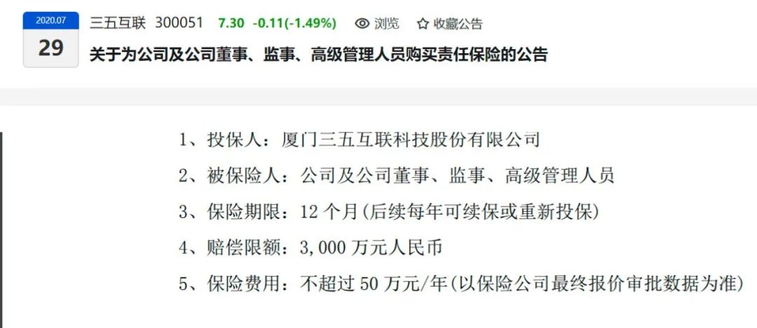 新证券法实施的背景下,违法违规成本大大提高了。“前科”累累的三五互联,想到了高管责任险。