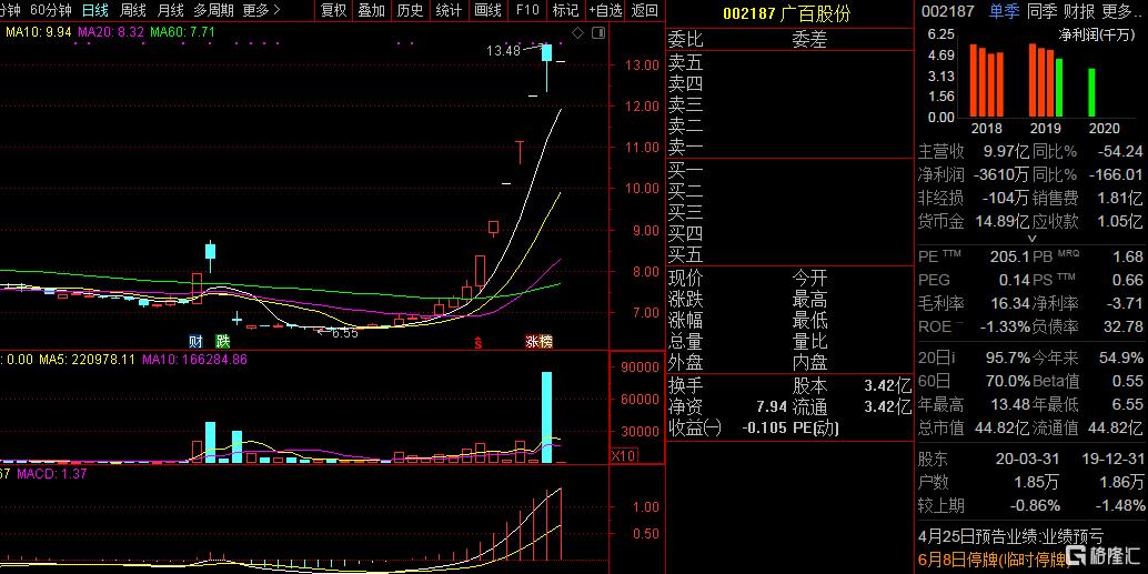 就在此次重组前,广百股份股价大幅异动,特别是最近的6个交易日,5个涨停板,最后一个交易日(6月5日)一度涨停,最后收涨6.86%,当天换手率高达24.91%。