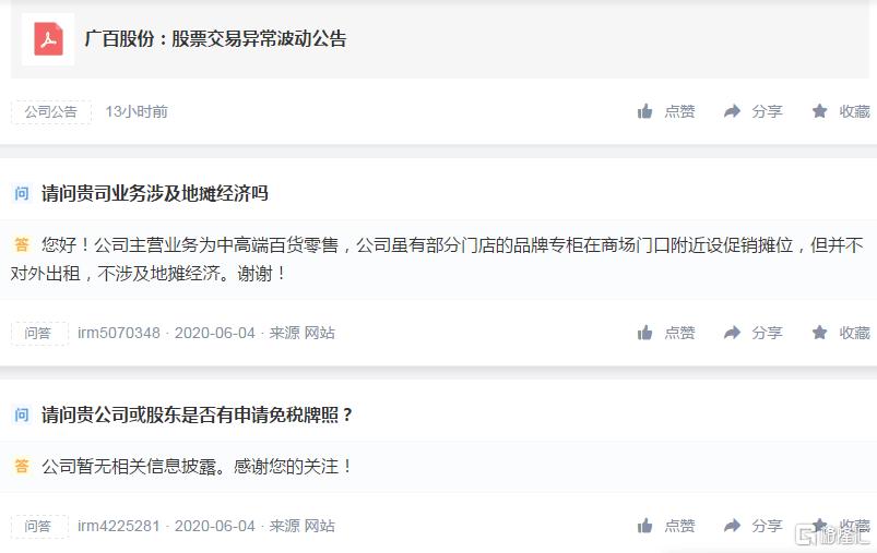 6月3日和6月8日,广百股份已经发布了两次股票交易异常波动公告,核心内容为:经向控股股东核实,除正在持续推进履行友谊集团 100%股权转让给广百股份的承诺事宜外,不存在关于公司的应披露而未披露的重大事项,或处于筹划阶段的重大事项。