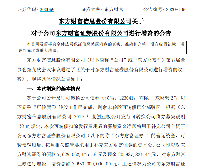 9月8日晚间,东方财富信息股份有限公司(下称:东方财富)公告称,公司以对全资子公司东方财富证券的债权76.29亿元及现金2093.78万元,对东方财富证券进行增资,增资总额76.5亿元。上述债权为公司向东方财富证券提供的借款,其中可转债募集资金及利息总额72.29亿元。