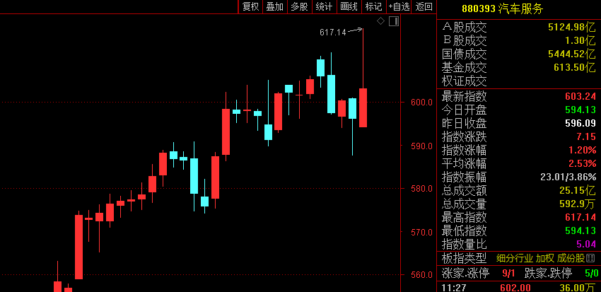 早间,汽车服务板块和汽车整车板块两极分化,一个大幅向上攻击,一个大幅向下撤退。汽车服务板块开盘初逆势直线拉升,一度涨近4%,领涨两市,中国中期大幅高开后秒涨停,中汽股份、浩物股份等亦大幅拉升。