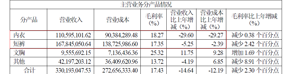 不过即便文胸销量逆势增长,但浪莎股份内衣和短裤才是营收贡献的大头。而这两部分的营收纷纷同比大降,内衣销售实现营收1.1亿元,同比下滑29.6%;短裤销售实现营收1.7亿元,同比下滑5.25%。实际上,浪莎股份产品本身的毛利率就不高,这两项业务的毛利率也出现了同比下滑。