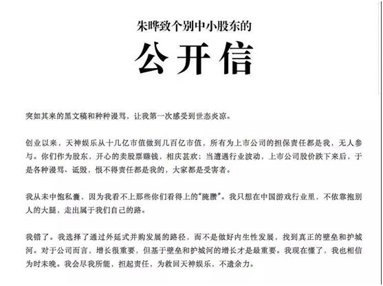 而在这场说明会结束的两天后,天神娱乐第一大股东、实控人朱晔公开发布致个别中小股东的公开信。在这份公开信中,朱晔表示: