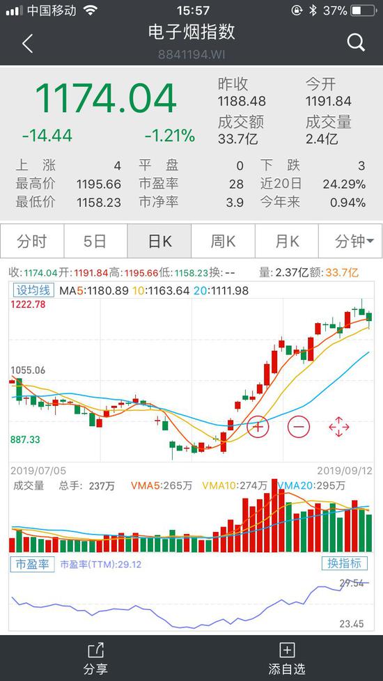 事实上,今天整个电子烟板块在开盘便一路快速下跌,虽然下午有所回升,但截至下午收盘电子烟指数跌幅仍达1.21%,在所有概念板块中位于领跌位置。而从8月份以来,该板块表现强势,涨幅达18.85%。