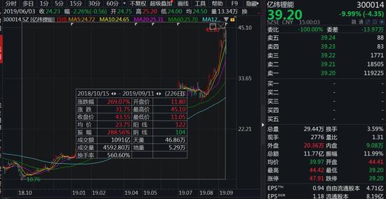 8月份以来表现强势的亿纬锂能开盘闪崩,成交量迅速放大,很快被死死压在跌停板上。