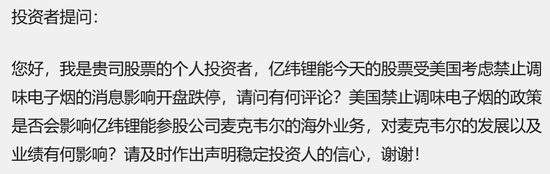 因为参投电子烟产业链龙头麦克韦尔,亿纬锂能业绩大放异彩,受到机构投资者青睐,股价和市值也迎来一波暴涨。然而,因为美国最新表态,拟打算下令禁售数千种非烟草口味的电子烟产品,亿纬锂能直接跌停,市值缩水40亿。今日公司回应投资者,该消息对公司影响有限。
