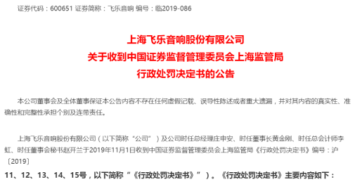 而飞乐也在2019年11月1日并发布公告,表示收到中国证券监督管理委员会上海监管局《行政处罚决定书》编号:沪〔2019〕11、12、13、14、15号。