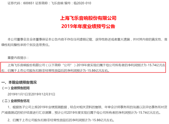 公告表示,上海飞乐音响股份有限公司2018年归属于上市公司股东的净利润为-32.95亿元,经财务部门初步测算,预计公司2019年度实现归属于母公司所有者的净利润预计为-15.74亿元左右,尽管较去年同期的有所好转,但仍未转亏为盈。