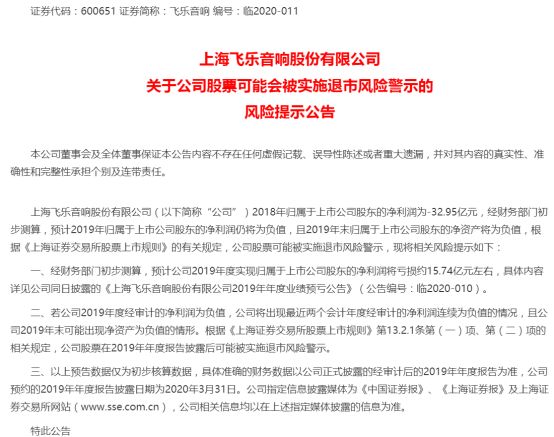 1月20日晚间,飞乐音响同时发布了关于公司股票可能会被实施退市风险警示和2019年年度业绩预亏两份提示公告。