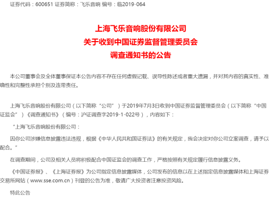 之后,飞乐于2019年7月3日披露公告称,收到中国证监会的《调查通知书》,因公司涉嫌信息披露违法违规,根据《证券法》有关规定,证监会决定对飞乐音响立案调查。