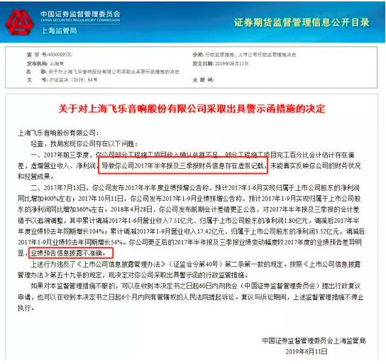 6月11日,上海证监局向飞乐音响出示了一份警示函。该警示函指出,公司在2017年的部分施工项目收入确认中存在虚增营业收入及净利的情况,导致当年的半年报和三季报财务信息存在虚假记载,未能真实反映公司的财务状况和经营成果。且2017年7月13日,公司更正后的2017年半年报及三季报业绩变动幅度较2017年度的业绩预告差异明显,业绩预告信息披露不准确。