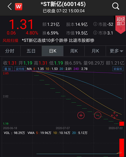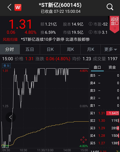 截至7月22日收盘,*ST新亿股价收报1.31元,当日成交金额达1.21亿元,市值为19.5亿元。