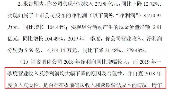 獐子岛2018年盈利3211万元后,2019年一季度就一把亏掉了4314万元。深交所要求上市公司说明出现这种情况的原因和合理性,并自查2018年度收入真实性,是否存在提前确认收入和跨期转结成本的情况。