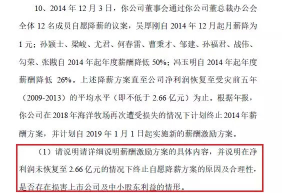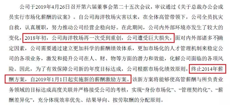 根据2018年报,獐子岛在2018年海洋牧场再次遭受损失的情况下,管理层却不愿意遵守之前的自愿降薪承诺了。计划终止2014年薪酬方案,并自2019年1月1日起实施新的薪酬激励方案。理由是“公司需要更加科学的薪酬绩效体系,激发业务潜力”。