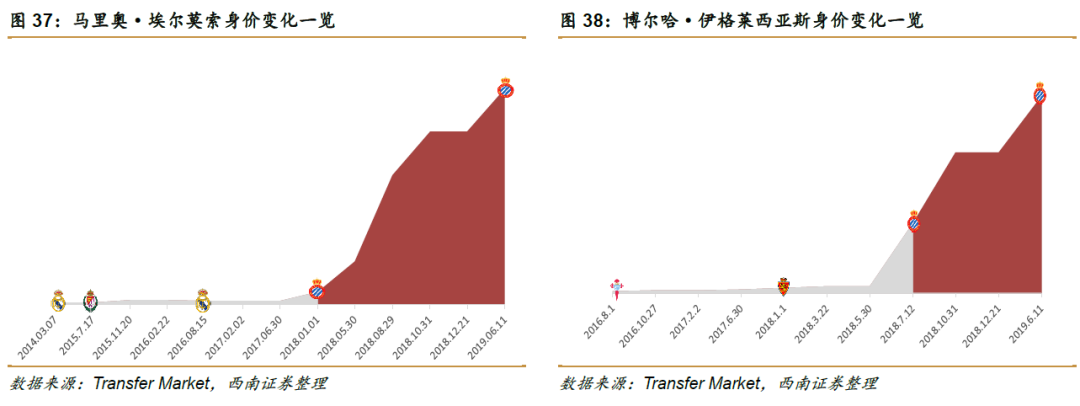 西南证券研报指出,西班牙人俱乐部形成了一整套转会市场策略,内部挖潜+外部引援充实球队竞争实力,通过专业训练和稳定联赛出场帮助球员积累比赛经验,提高技战术水平和商业价值,最后以相对理想的价格进行出售获取转会差价。与充满不确定性的偶然事件相比,良性球员流动的商业逻辑更具有长期确定性。