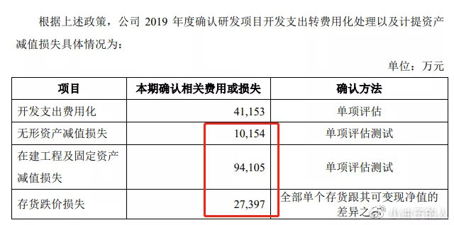公告称,根据评估和测试结果,公司部分资产存在减值的情形。其中,对公司研发项目开发支出转费用化处理4.12亿元及计提外购技术相关无形资产减值准备1.02亿元;对公司在建工程/固定资产计提资产减值准备9.41亿元;计提存货跌价准备2.74亿元。上述研发项目开发支出转费用化处理以及计提资产减值准备,相应减少了公司2019年度的净利润。