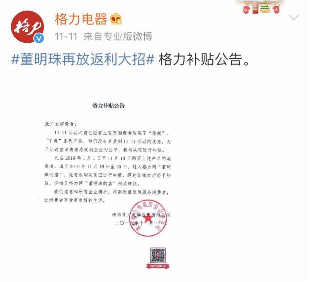 11月11日当晚,格力电器再次出击加大促销力度,称2019年1月1日至11月10日购买“俊越”和“T爽”系列空调产品的消费者,可在11月18日至30日登陆董明珠的微店“董明珠的店”,凭有效购买凭证进行申报。经核实后,格力电器将给予补贴。