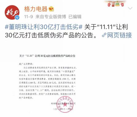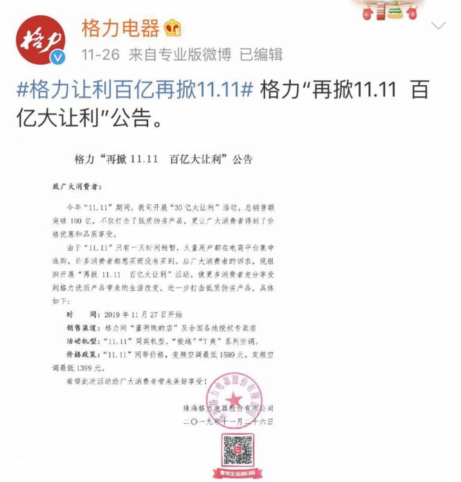 或许是尝到双11让利40%带来的甜头,11月26日晚间,格力电器再发“让利”公告,称今年“11.11”期间,公司开展“30亿大让利”活动,总销售额突破100亿,不仅打击了低质伪劣产品,更让广大消费者得到了价格优惠和品质享受。然而,由于“11.11”只有一天时间短暂,大量用户都在电商平台集中选购,许多消费者都想买而没有买到。应广大消费者的诉求,现组织开展“再掀11.11 百亿大让利”活动。