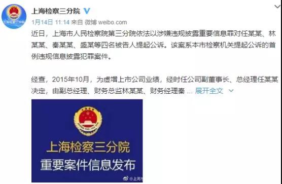 1月14日,上海市检察三分院通告首例上市公司涉嫌违规披露重要信息罪被提起公诉的刑事犯罪案件。