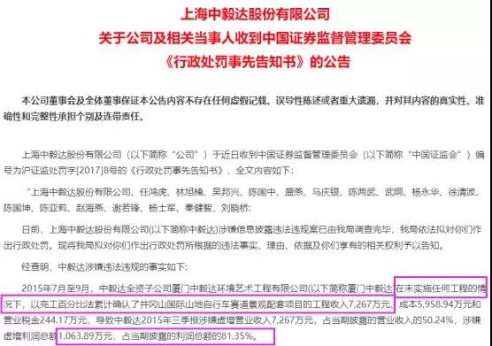 根据行政处罚书显示,在2015年7月至9月,中毅达全资子公司厦门中毅达在未实施任何工程的情况下,以完工百分比法累计确认了井冈山国际山地自行车赛道景观配套项目的相关工程费用,包括工程收入7267万元、成本5958.94万元和营业税金244.17万元。
