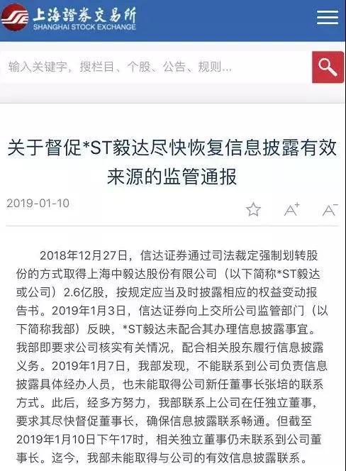 2019年1月日, 上交所披露的监管工作函称,监管部门自2019年1月7日起已无法与*ST毅达公司新任董事长、独立董事或负责信息披露的具体经办人员建立联系,公司高层处于“集体失联”状态。截至监管函发送时,董事长张培仍然失联。