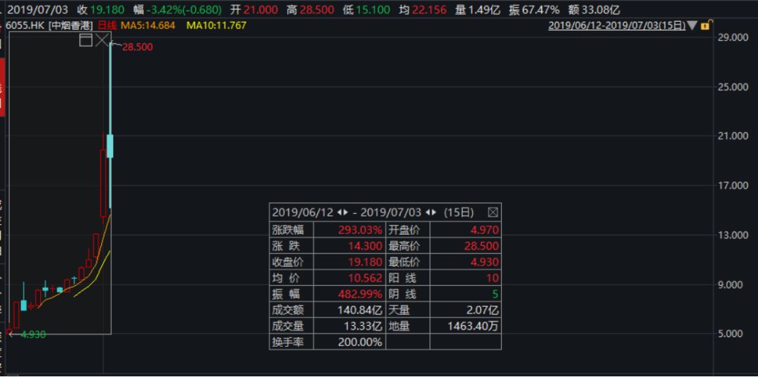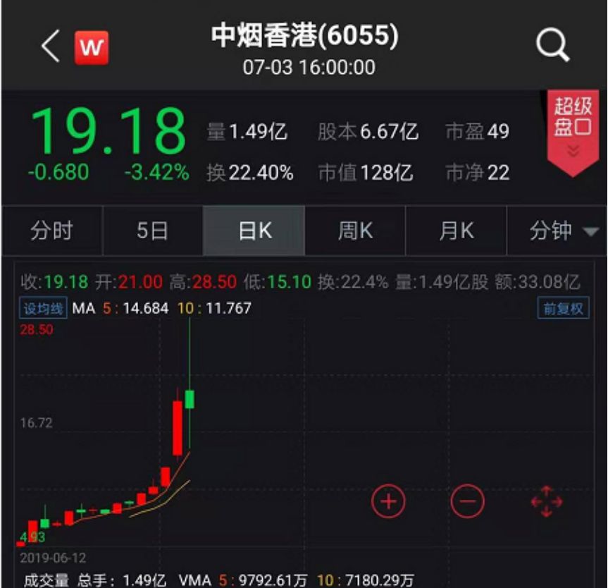 中烟香港自6月12日上市以来接连暴涨,7月3日早盘一度暴涨43.5%,最高报25.8港元,是上市时股价的4.23倍。
