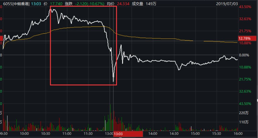 临近午盘,从11点49分开始,中烟香港从25.8港元开始暴跌,到午后13点05分,最低下探至15.1港元,在16分钟内暴跌41.5%,随后其跌幅缩窄至3.42%左右。