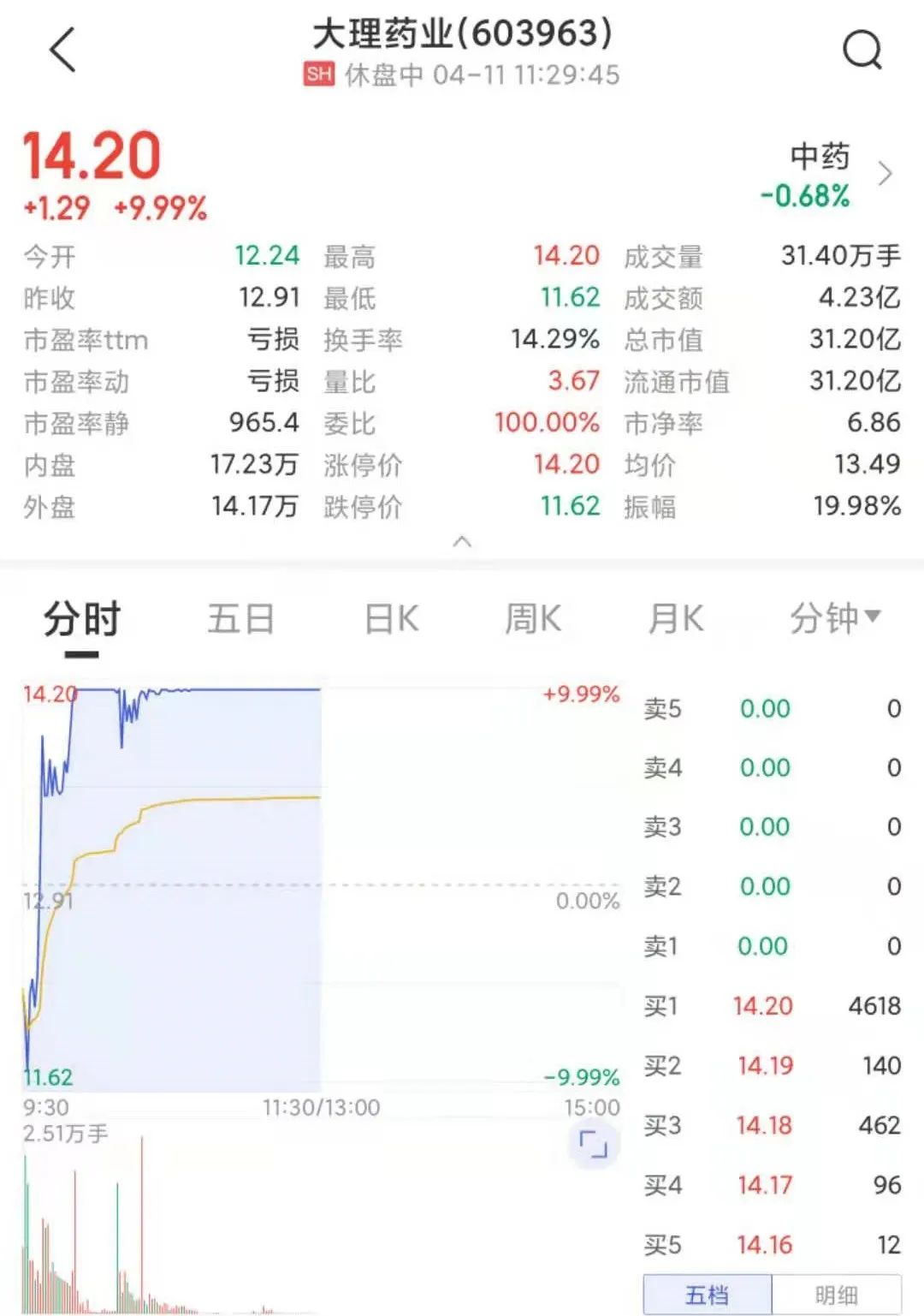 4月11日,大理药业开盘后一度触及跌停,其后拉升至涨停,上演“地天板”,股价收获4连板。值得一提的是,该股在3月9日也上演过“地天板”走势。