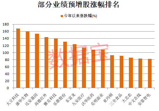 在二级市场上,业绩预增股早已有所表现。数据显示,今年以来有10股累计涨幅已翻倍,分别是大立科技、康华生物、达安基因、高德红外、雅克科技等。大立科技累计涨幅168.29%排在第一位,公司主营红外热像仪产品,昨日该股盘中创下历史高点29.55元后回落。上半年,受疫情影响,大立科技作为工信部疫情防控重点物资生产企业,持续满负荷生产,防疫类产品海外订单也持续快速增长。公司还深挖巡检机器人在特高压、轨道交通等新兴建设领域的市场潜力,在机器人的巡检方式、数据读取、5G通讯等多方面创新应用。大立科技预计上半年净利润为2.8亿元至3.3亿元,同比增长378.5%至463.94%。