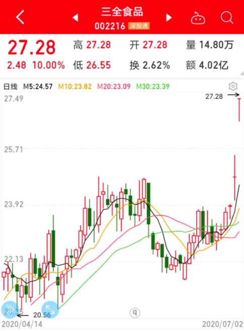 业绩暴增公司显然更受投资者青睐,近几日不少公司在业绩预告披露后股价大涨。7月1日晚间,三全食品发布业绩预告,由于改善渠道质量,聚焦核心场景,加大产品创新,同时得到子公司股权转让的相关收益、政府疫情期间为支持企业复产复工发放的稳岗补贴等补助资金,公司预计上半年净利润为4.35亿元至4.62亿元,同比增长390%至420%。在消息公布后的次日,三全食品开盘后迅速被封上涨停板,最新收盘价已创历史新高。