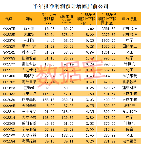 证券时报·数据宝统计显示,按照预告下限计算,72股上半年净利润预计增幅在50%以上,新五丰、大北农、三利谱、星网宇达、雅本化学等股净利润预计增幅在10倍以上。预计增幅最高的是新五丰,因生猪价格上升,公司预计上半年净利润为1.6亿元至2.4亿元,同比增长25倍以上。在这72股中,不乏一些细分科技领域龙头公司,如红外热像龙头高德红外、光刻机材料龙头雅克科技、基因检测龙头达安基因、精密连接器龙头长盈精密、高纯溅射靶材龙头江丰电子等。