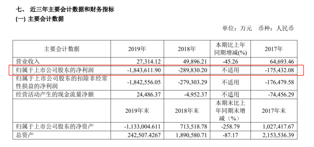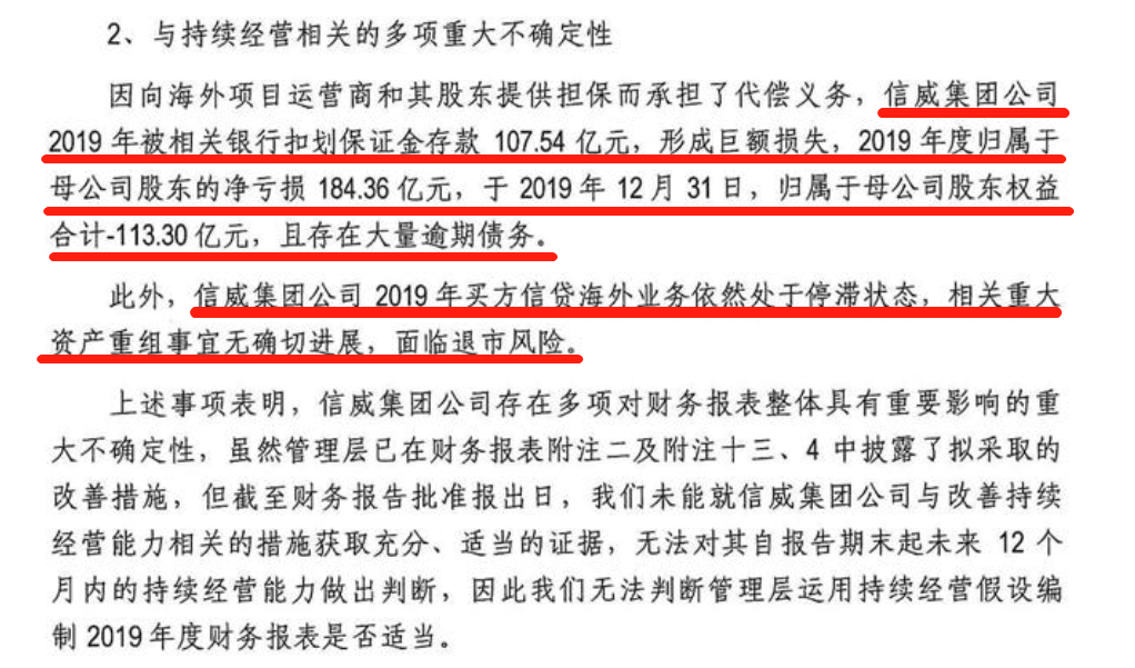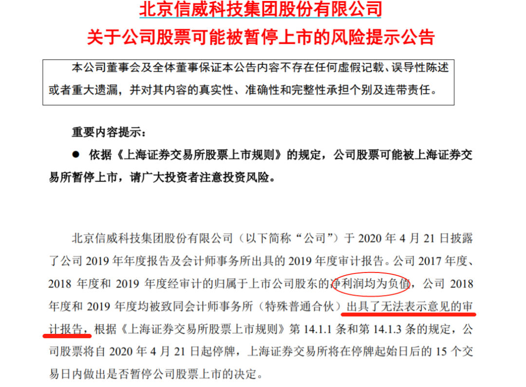 4月20日晚间,*ST信威披露的年报显示,2019年公司亏损额高达184.36亿元。此前,*ST信威已经连续两年亏损,2017年、2018年连续亏损17.54亿元、28.98亿元。同时,公司在2019年继续被会计师事务所出具无法表示意见的审计报告,已经触发了暂停上市规则。