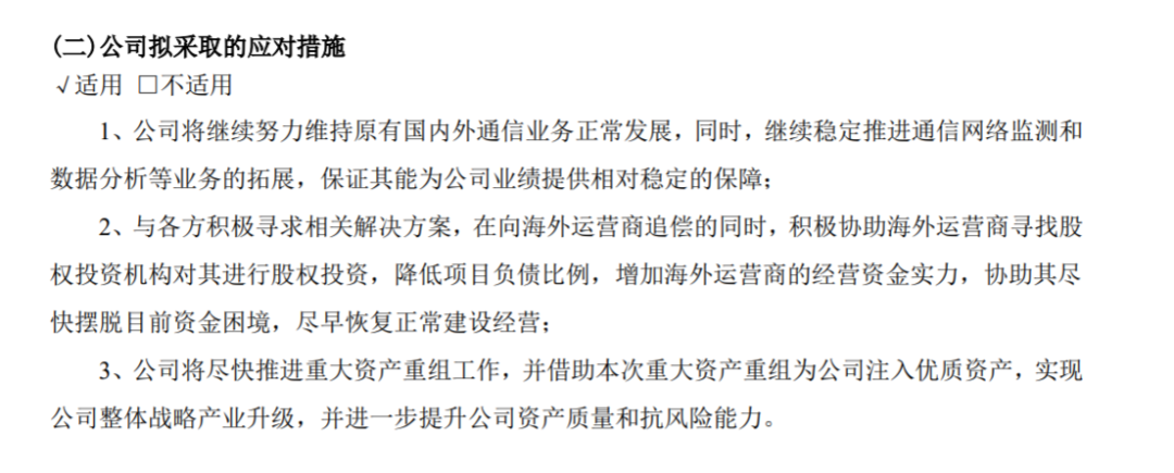 对于2020年,*ST信威提出以下三方面工作,核心要点:向海外运营商追偿、寻找股权投资、推进资产重组。