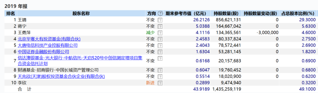 *ST信威目前的十大股东中,2019年中报还持股的社保基金已经不在其列。根据公司2019年三季报和2019年年报披露,大唐电信科技产业控股公司、王勇萍都在持续减持。截至2019年底,机构持股比例合计14.25%,相比2018年底下降5个百分点;证金公司持股数量不变,仍有0.53亿股,占总股本的1.82%。