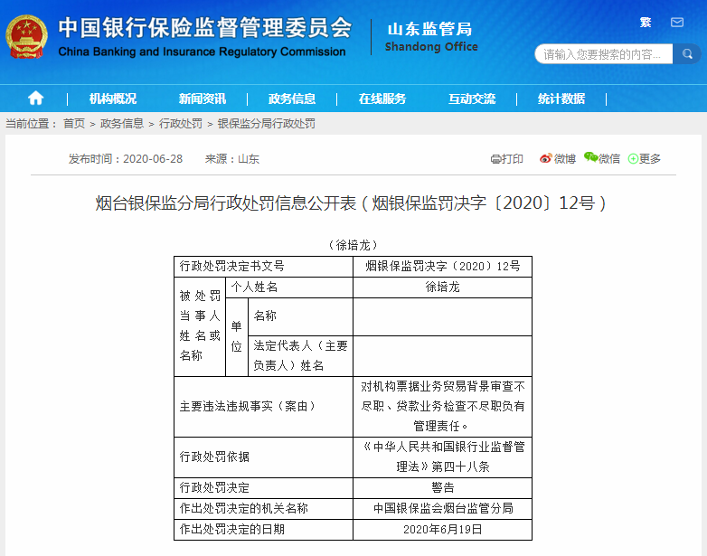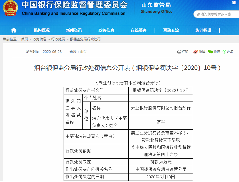 兴业银行烟台分行被罚60万 因存在贷款业务检查不尽职等违法违规事实