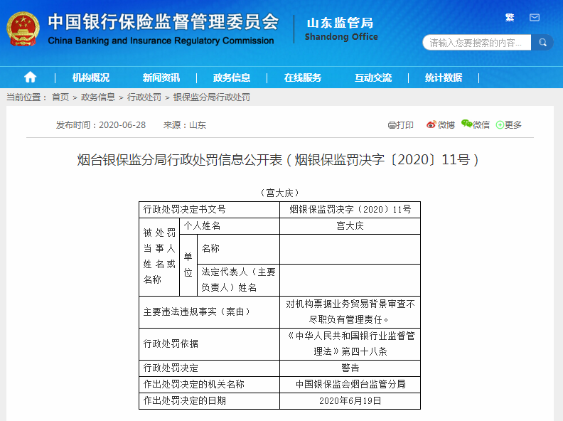 据银保监会网站消息,6月28日,烟台银保监分局开出的行政处罚信息公开表显示,兴业银行股份有限公司烟台分行存在票据业务贸易背景审查不尽职、贷款业务检查不尽职的违法违规事实,被罚款60万元。