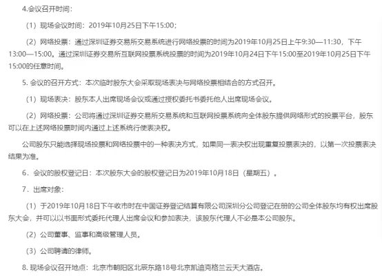 通过深圳证券交易所互联网投票系统投票的时间为2019年10月24日下午15:00至2019年10月25日下午15:00的任意时间。这意味着,网络投票时间要早于现场会议时间。