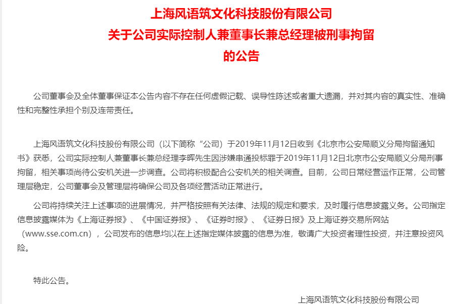 11月12日晚间,上市公司风语筑发布公告称,公司实际控制人兼董事长兼总经理李晖先生因涉嫌串通投标罪于2019年11月12日北京市公安局顺义分局刑事拘留,相关事项尚待公安机关进一步调查。