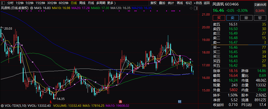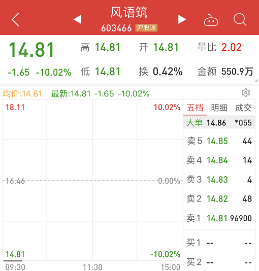 今日早盘,风语筑毫无悬念跌停,下跌10.02%,报价14.81元。
