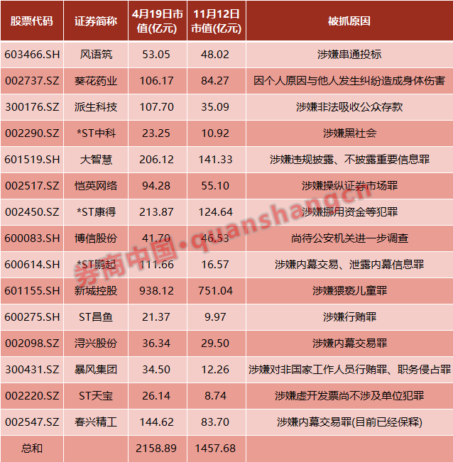 据券商中国记者粗略统计,今年以来已经有15家上市公司的实控人被抓,从今年4月份市场的高点算起,这15家上市公司的市值已经蒸发近700亿元。