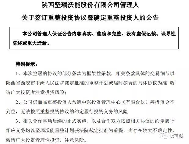 因子公司沃特玛资金链断裂,陕西上市公司坚瑞沃能深陷债务危机,濒临退市。来自湖南的常德中兴入局,为坚瑞沃能带来一丝曙光。12月10日,坚瑞沃能、管理人与常德中兴签署《重整投资协议》。