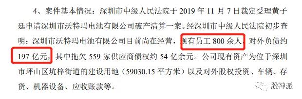 到今年11月13日,坚瑞沃能发布公告称,深圳市中级人民法院已裁定受理黄子廷申请深圳市沃特玛电池有限公司破产清算一案。彼时公布的资料显示,沃特玛有员工800余人,对外负债约197亿元,拖欠559家供应商债权约54亿余元。