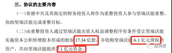 协议称,常德中兴将通过坚瑞沃能出资人权益调整程序,以1亿元的对价有条件受让坚瑞沃能实施资本公积转增股本形成的17.34亿股,并收购坚瑞沃能6.1亿元债权类资产,共向坚瑞沃能提供7.1亿元资金。