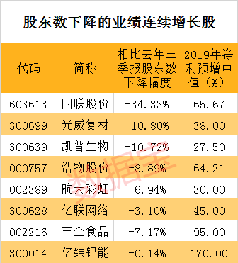相比三季度末,上述业绩连续增长个股中,部分股票最新股东户数有变化,其中7只个股股东户数出现下降,包括国联股份、光威复材、凯普生物、浩物股份、航天彩虹、亿联网络和三全食品。