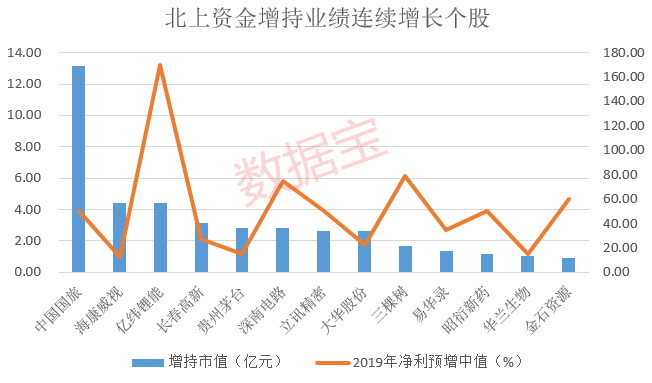 长春高新被北上资金加仓3.15亿元,公司去年净利预增20%-35%,贵州茅台、深南电路、立讯精密、大华股份等几只业绩白马股北上资金加仓金额均超2亿元。