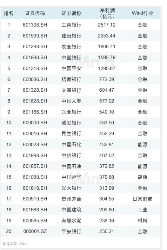 据wind统计显示,前三季度,工行、建行、农行、中行和中国平安净利润均超过1000亿元位居前五,且净利润前20名中有14家属于金融业。