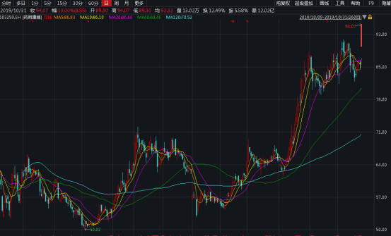 10月31日,创新药龙头股药明康德开盘高开高走,不到半个小时,股价飞涨,资金迅速打上涨停板。当天10点左右时分,药明康德股价报收94.07元,市值飙升至1524亿元,短短半日,市值大涨超125亿元。而这也是药明康德年内的最高价格。