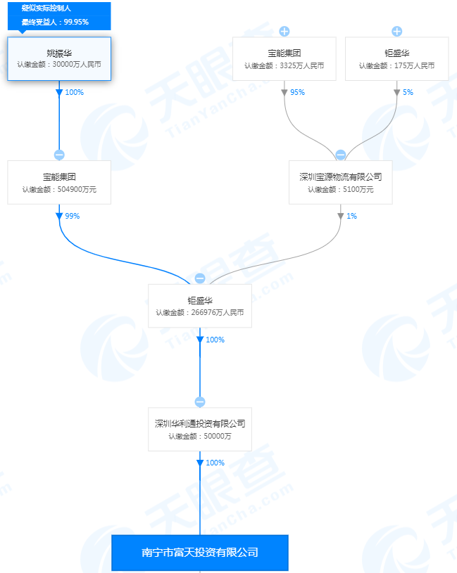 南宁富天是钜盛华全资孙公司,实际控制人是姚振华。在竞得上述股份之前,南宁富天已经位列南宁百货第二大股东,持有7977.55万股,占总股本的14.65%。加上此次竞得的股份,南宁富天持股比例升至18.85%,超过南宁沛宁资产经营有限责任公司(下称“南宁沛宁”),成为单一持股最大的股东。