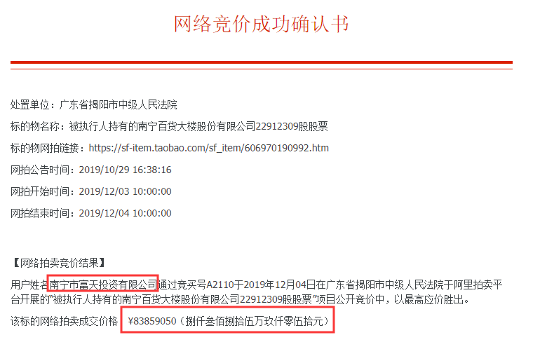 12月4日上午10点,南宁市富天投资者有限公司(下称“南宁富天”)竞得深圳市北部湾电子商务有限公司持有南宁百货2291.23万股股份,成交价格8385.91万元。